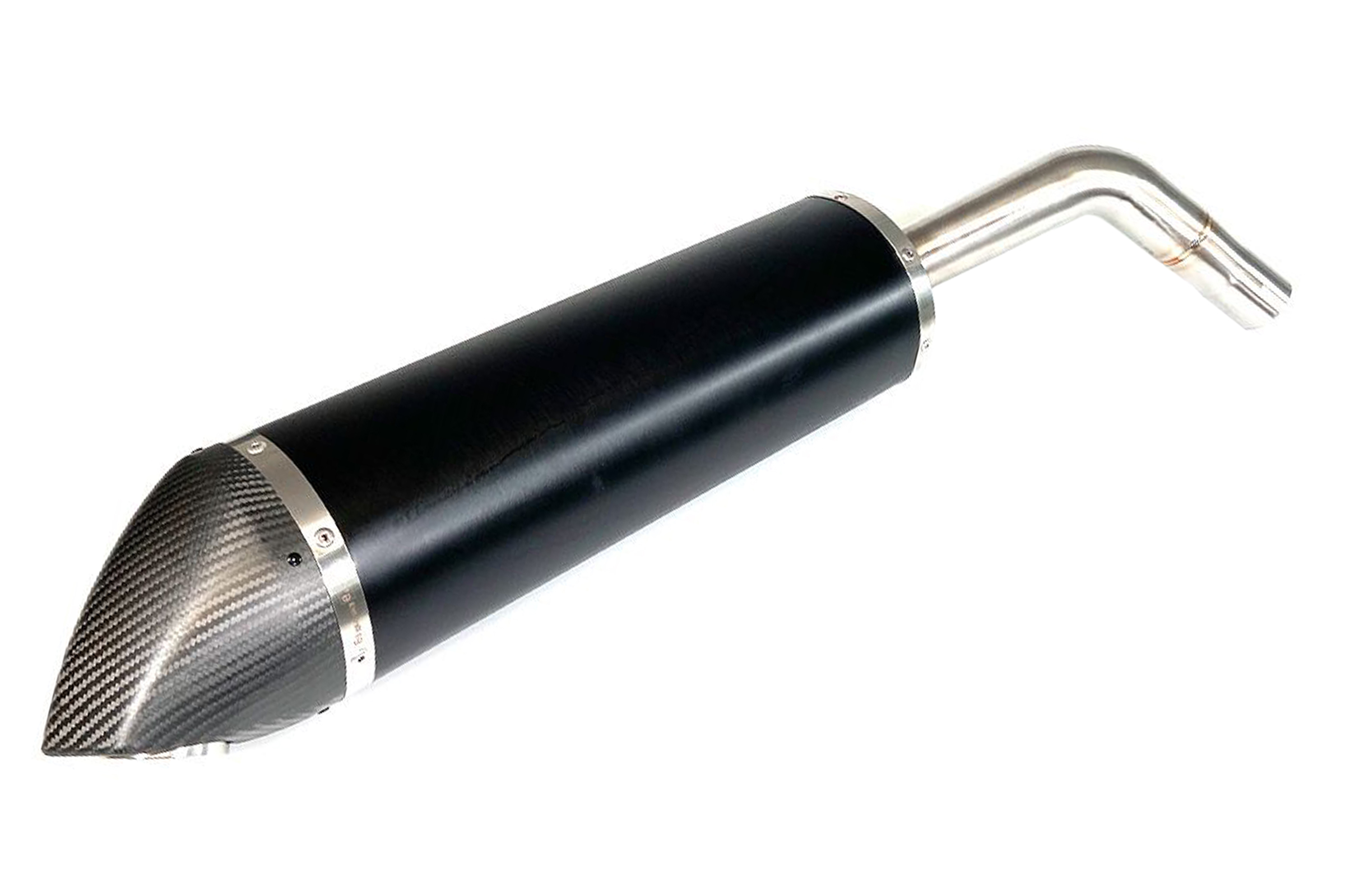 TUV certified silencer with a removeable baffle for racing use. Lightweight silencer in italian design. All connection parts, the inner parts and tubes are made of stainless steel.The outer shell is made of aluminium or the stronger and more leightweight titanium. On both versions the end cap is made of light high tech carbonium. The exhaust is avaiable as a slip-on silencer or as a complete race system including the headers.
