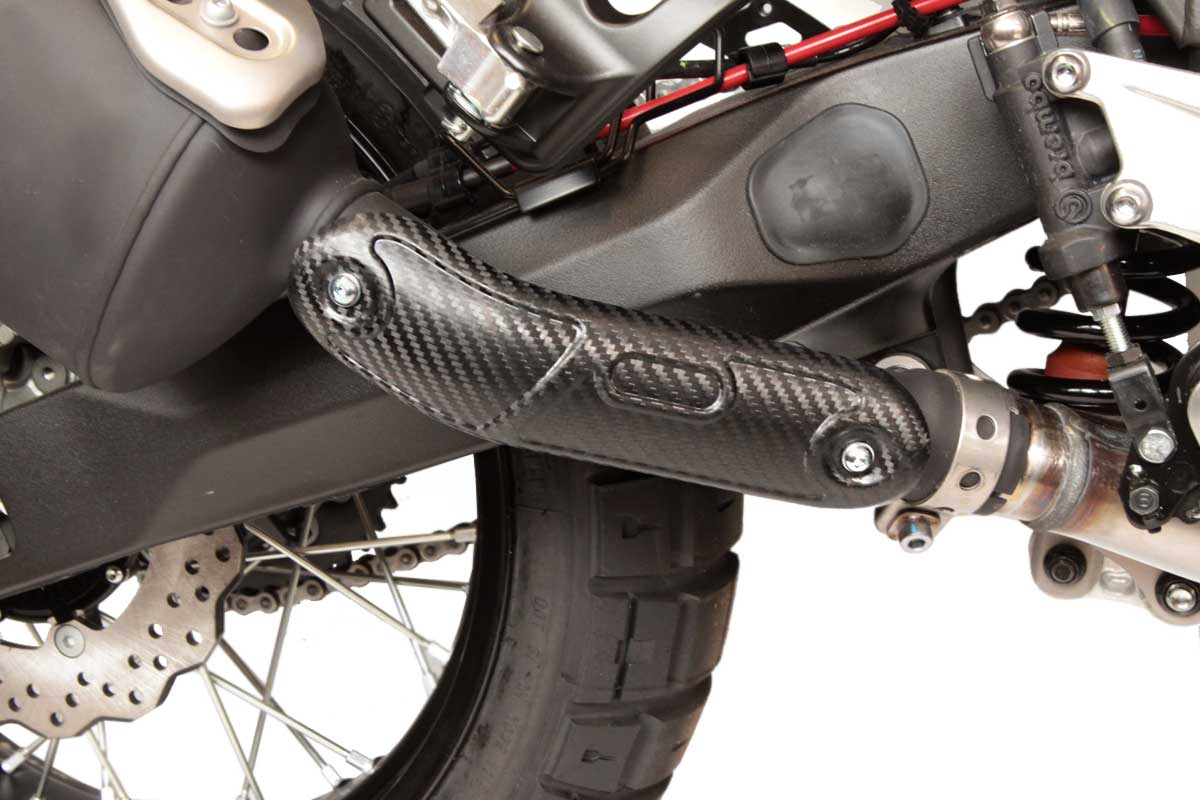 Lightweight, high quality manufactured Carbonium manifold / boot heat protection for the Yamaha Tenere 700. Fits for the oem silencer and all silencers with mounting option for the oem head shield