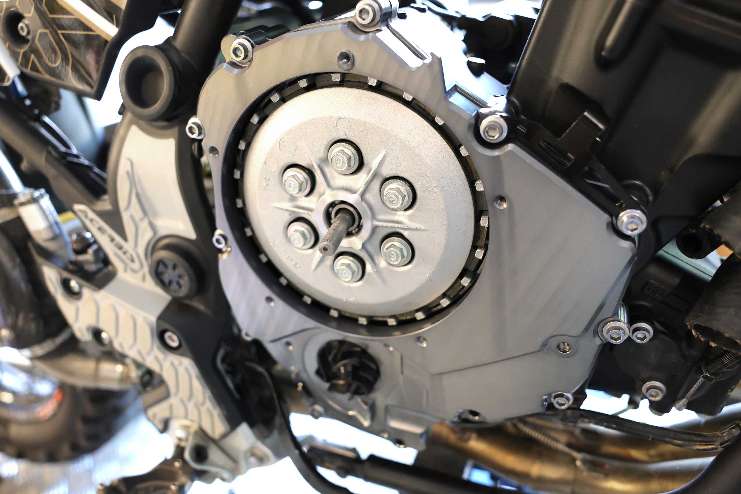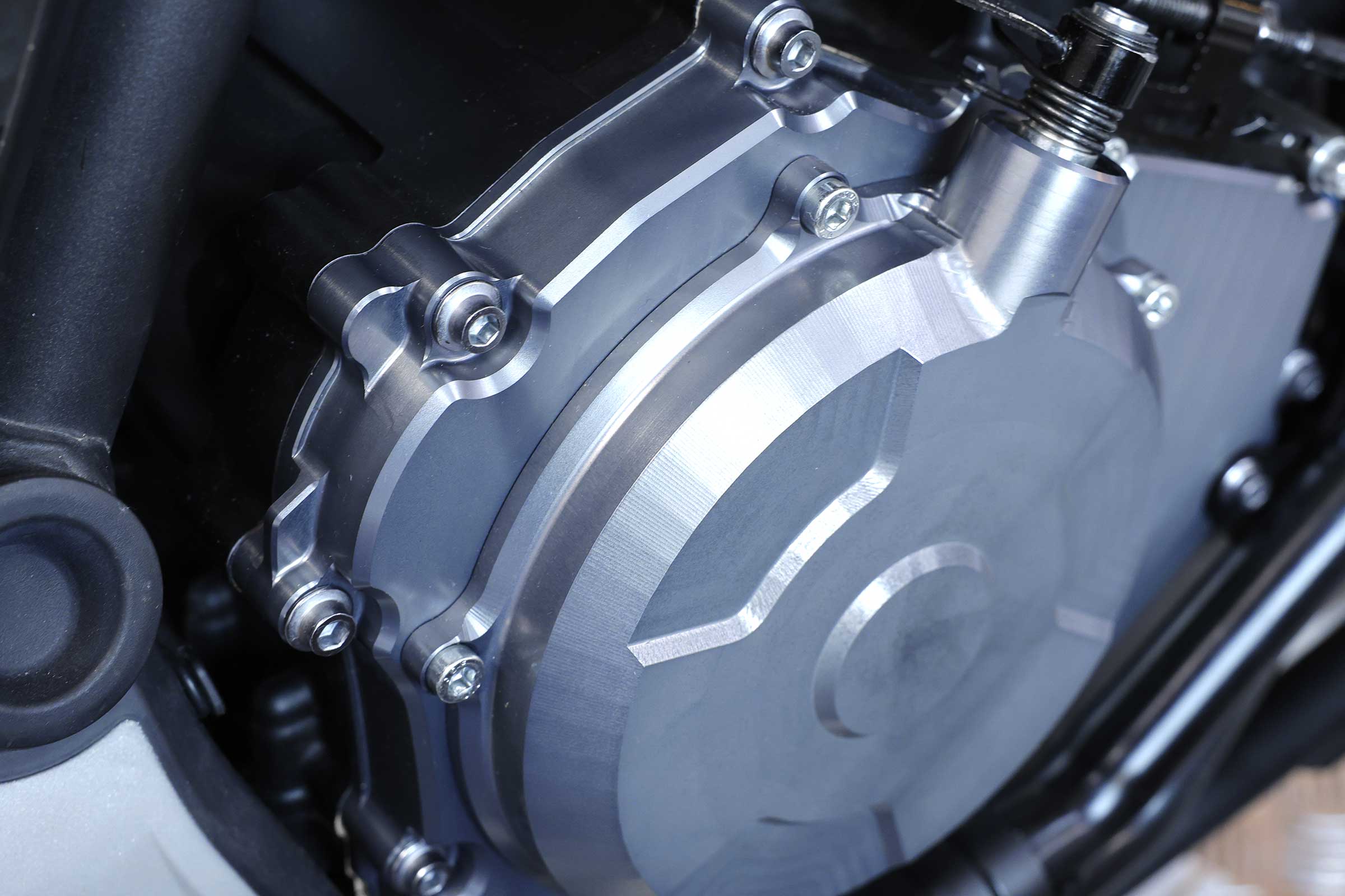 The right-hand engine clutch cover is now split into 2 parts. Quick and easy access to the clutch is now achieved by unhooking the clutch cable and loosening the 5 screws on the outer cover. The cover seals securely to the engine with a reusable O-ring.
