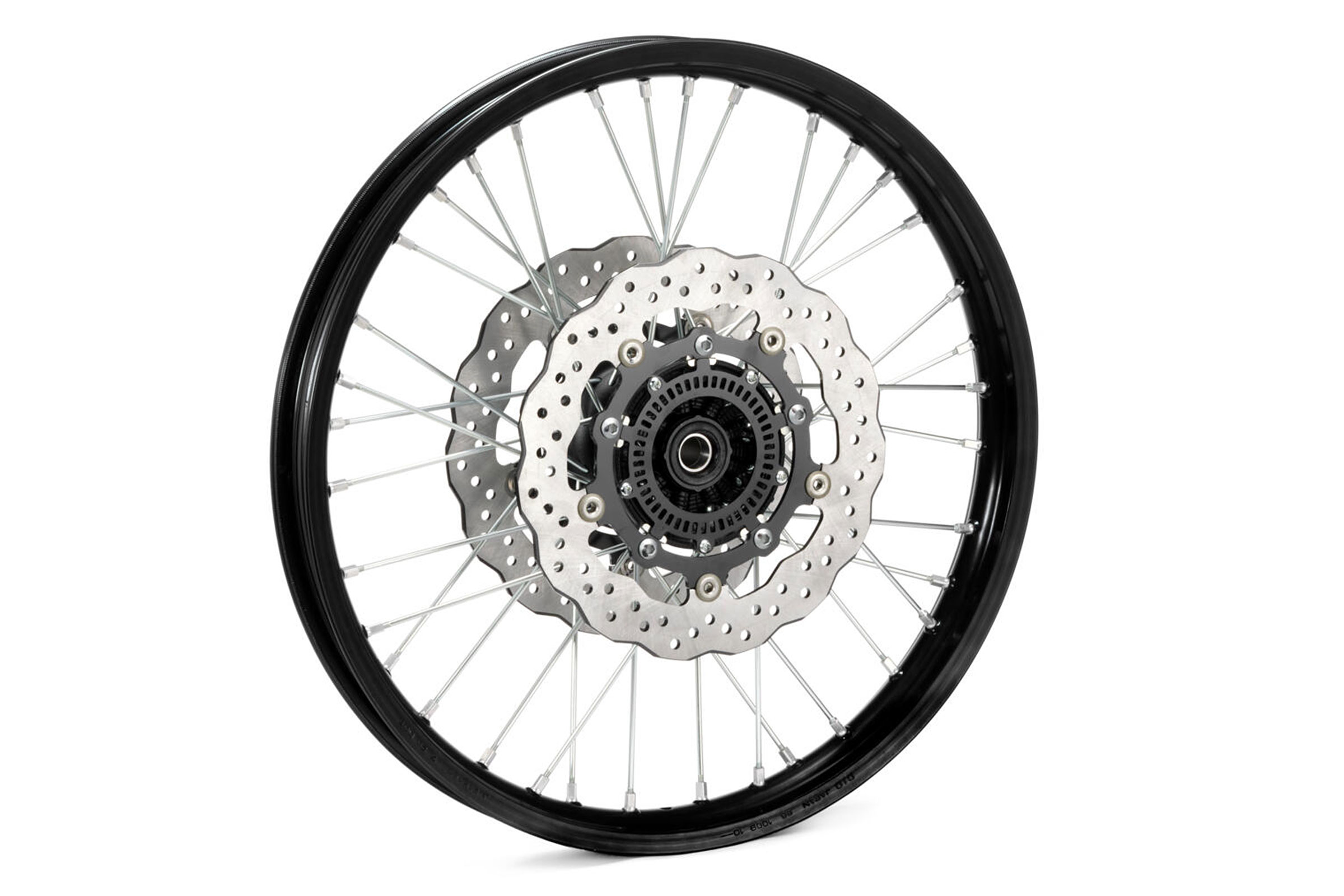 High quality frontwheel with high grade DID aluminium rim, black aluminium hub, brake disc rotors and ABS sensor ring.