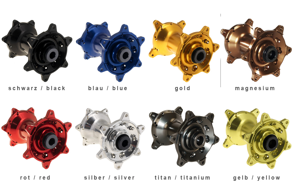 Hubs are avaiable in black, silver, blue, gold and red anodised or nickel plated (shiny silver). The Excel rims come in black, silver, gold or blue anodised.