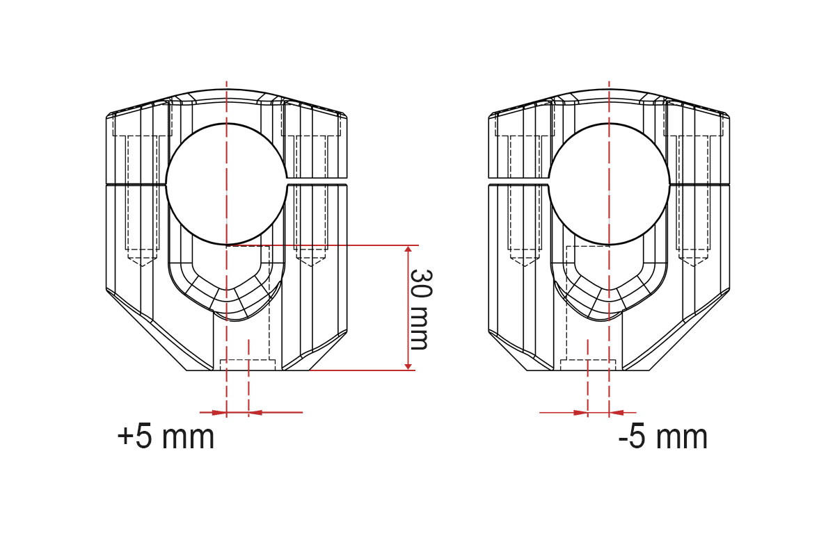 The excentric manufacturing of the clamps offers a +/-5 mm for- or backward orientated handlebar mounting positon compared to a centered position.