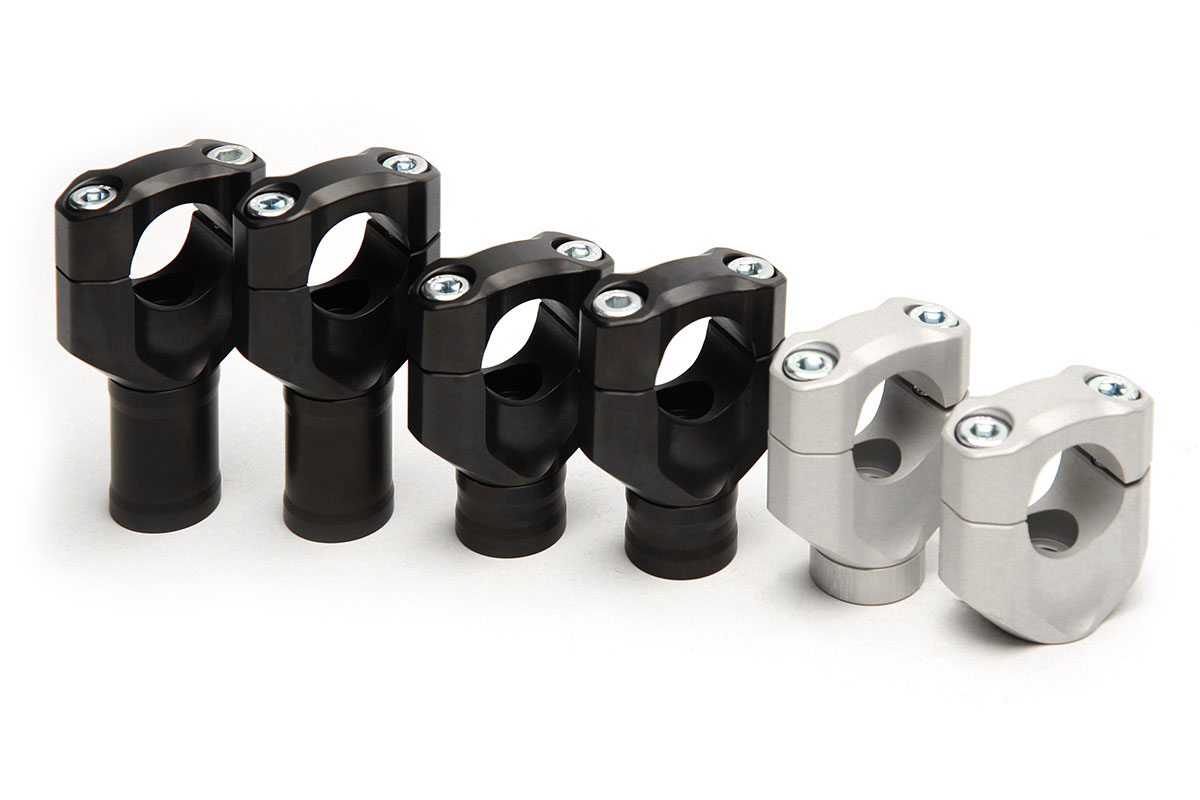 The fully cnc machined clamping sets have a height of 20mm (bottom of clamp to lower side of handlebar). By using the avaiable distance bushings almost all needed heights are possible.
