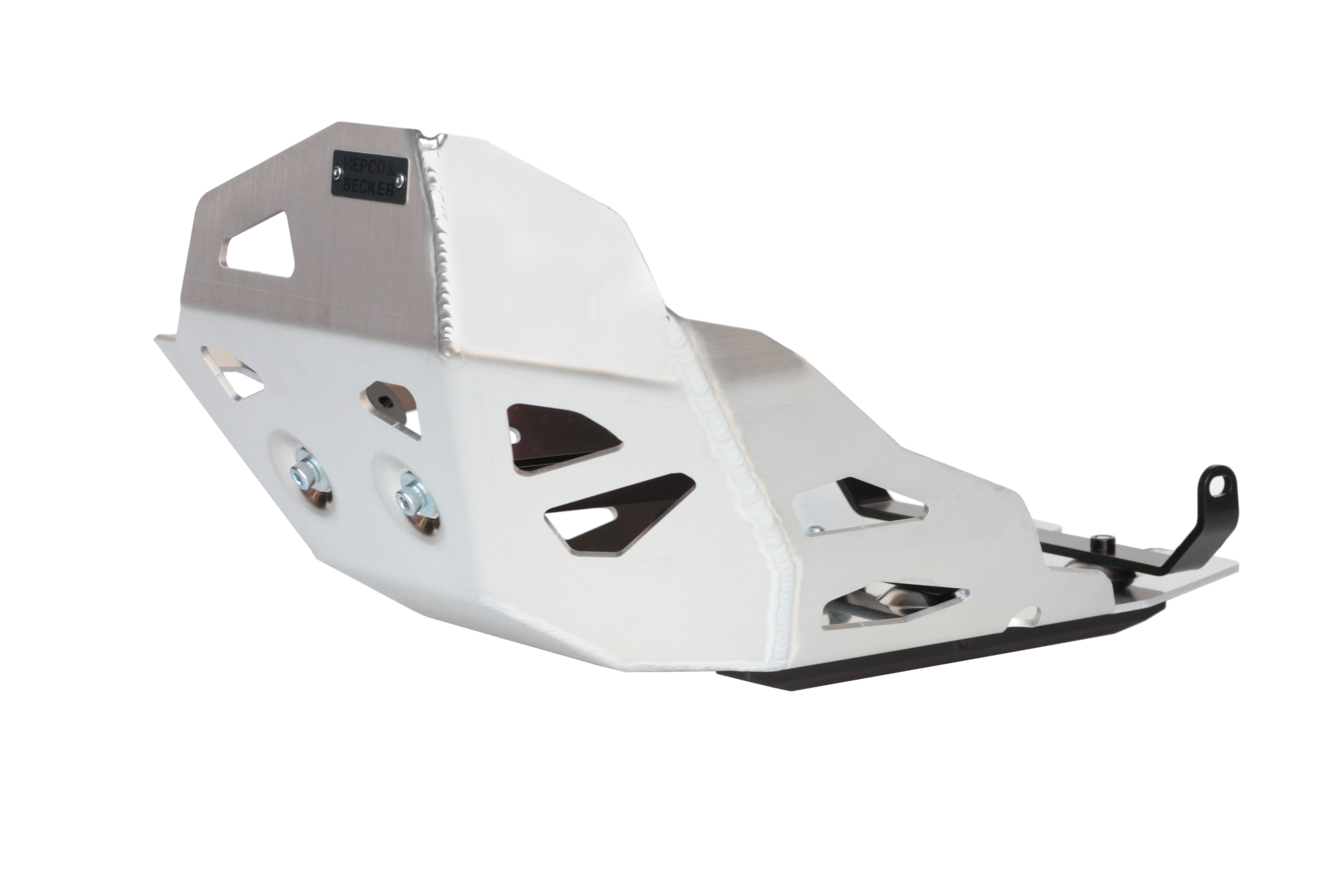 Strong bash plate with high sides to protect the engine case. Precisely made for the Yamaha Tenere 700. Made of 4mm aluminium, WIG welded. Made of 4mm extrem strong aircraft aluminium, WIG welded and with bolt on plastic glide pads on the bottom. Protects the waterpump tubes and the engine case. The bottom of the guard is flat, so the bike can be lifted on the guard e.g. to change a tire without a centre stand!