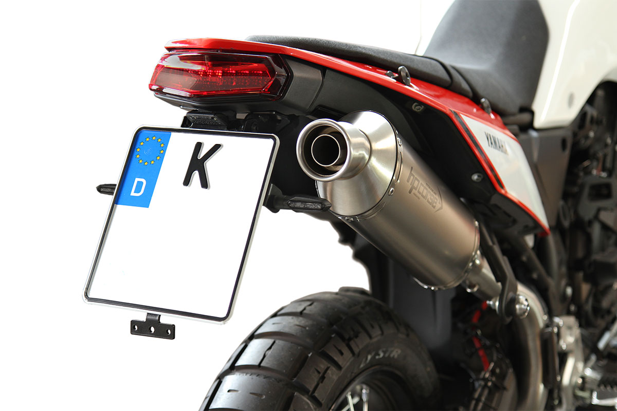 Tail tidy kit with variably adjustable number plate holder for the Yamaha Tenere 700 2023 onwards The adjustable angle of inclination and the adjustable indicator holders allow a variety of mounting options. The original number plate / indicator holder is equipped with a splash guard or number plate holder that extends far downwards. This not only looks unsightly but also tends to break off in off-road use. No sawing, bending, drilling on the original parts while installing out tail tidy kit- everything is supplied ready for installation. The filigree holder in high-quality aluminium-steel combination with black powder-coated or anodised finish has been specially developed for the Tenere 700, is robust, weather-resistant and will withstand harshest conditions. The indicator adapters can be adjusted in width (175-210 mm) and fixed in three positions. The angle of inclination is continuously adjustable via slotted holes. Delivery includes high-quality LED number plate lighting with elegant and clean cable routing and indicator adapters for accessory turn signals, alternatively OEM Yamaha turn signals. Number plate holder made of laser-cut and CNC-bent aluminium. Extra strong, off-road adjustable joint made of 3 mm plastic coated steel. Black plastic-coated or black anodised finish for long-lasting surface quality. The Tenere 700 benefits immensely visually from this sporty rear end. It makes the motorbike as a whole appear much lighter and sportier. Details: Fits all Tenere 700 2023 onwards with aftermarket indicators that have an M8 or M10 thread Adjustable licence plate holder made of laser-cut aluminium and steel. Adjustable indicator position Width of licence plate area: 180 mm Incl. licence plate holder and licence plate light incl. adapter able for aftermarket indicators Material: aluminium, powder-coated Licence plate light - E-approved No original parts have to be changed or destroyed! Rebuilding to the original parts is possible at any time. Compatible with the high HP Corse and MIVV Rallye silencer. Version for accessory turn signals with M8 thread Reflector / Reflector not included - please order separately if required. See accessories Scope of Delivery: Tail tidy kit LED number plate light Adjustable licence plate holder Adapter brackets for 8 mm threaded aftermarket indicator Adapter cable for aftermarket indicators Fits for all: Yamaha Tenere 700 2025 onwards Yamaha Tenere 700 Rally 2025 onwards Yamaha Tenere 700 2019 - 2024 Yamaha Tenere 700 Rally Edition 2020 - 2024 Yamaha Tenere 700 Extreme 2023 - 2024 Yamaha Tenere 700 Explore 2023 - 2024 Yamaha Tenere 700 World Raid 2022 - 2024 Yamaha Tenere 700 World Rally 2023 - 2024