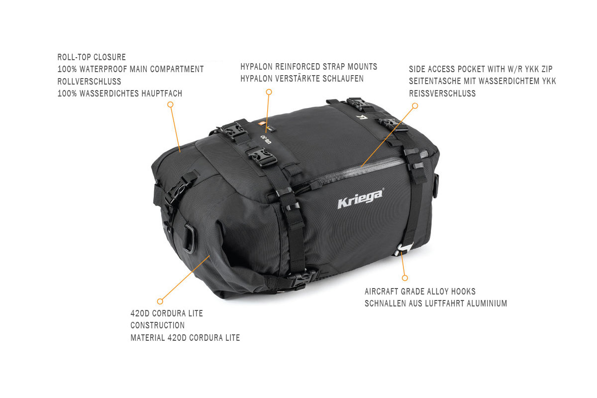 The Kriega US-Drypacks are designed for riding in the most demanding of environments. Use as single stand alone pack or as a multi-pack storage system with the addition of other packs in the US range.
