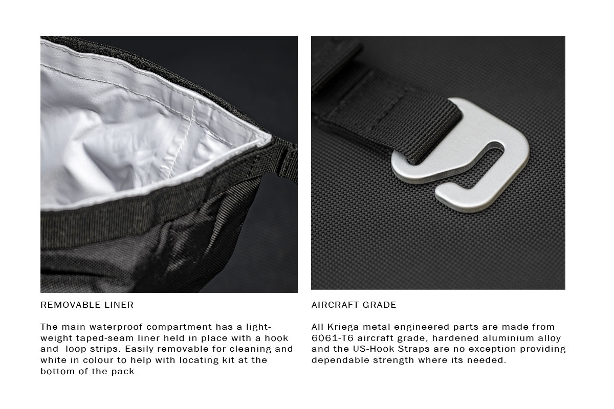 - Hook-on to any Kriega Backpack for additional waterproof storage.