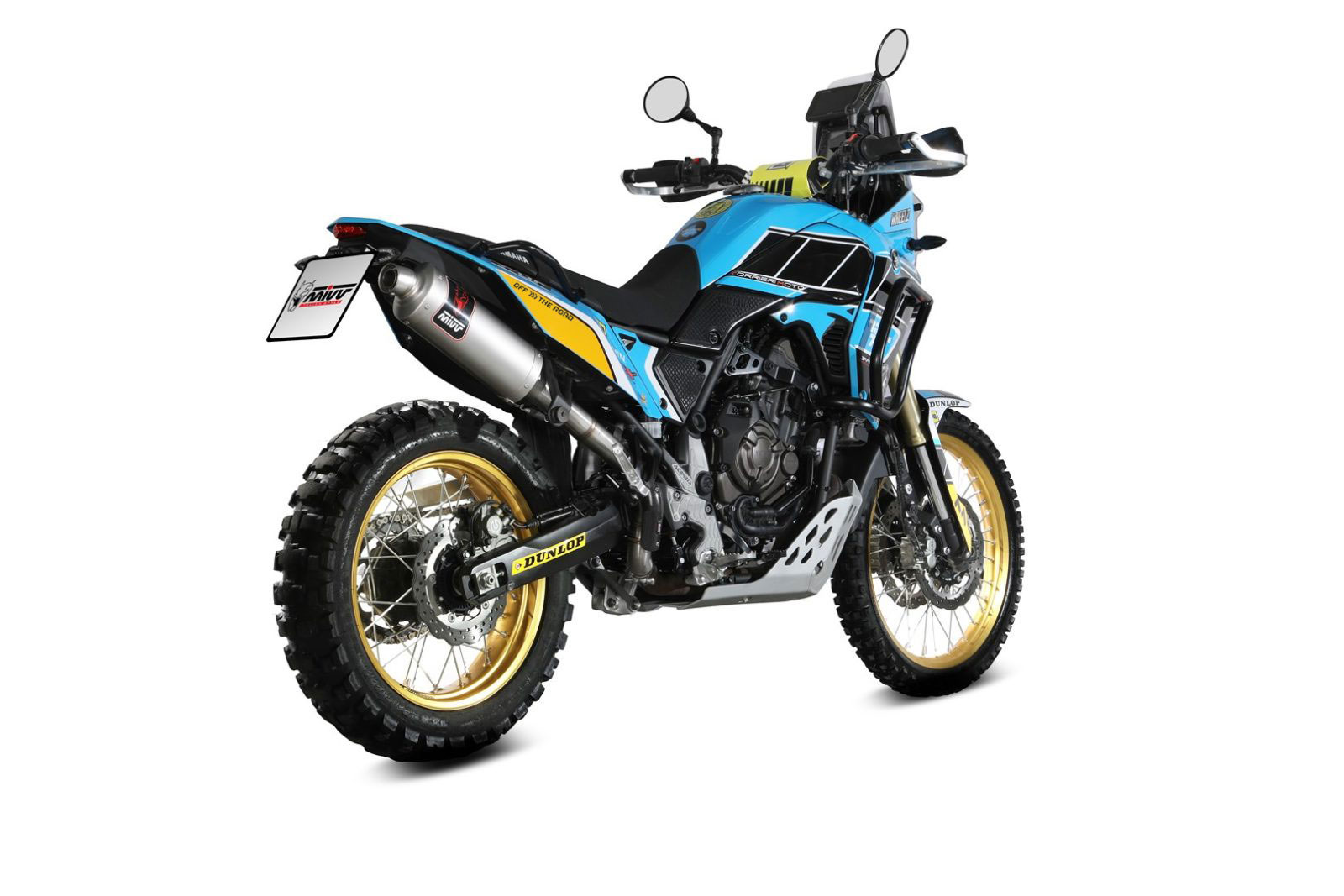 Upgraded 2023 version with modified connection pipe so that the swingarm can no longer come into contact with the pipe. Pictures with light blue Tenere show the old 2022 version!