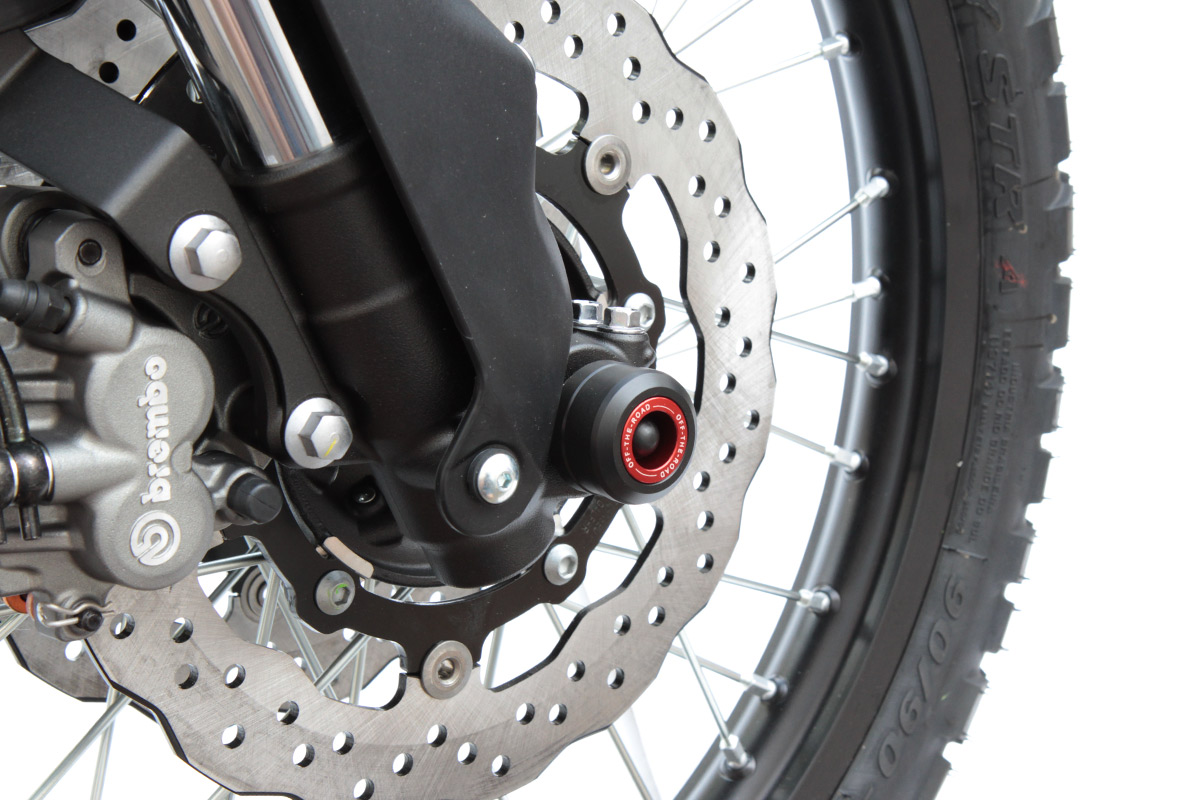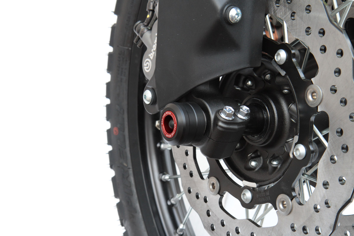 Axle crash protection pads made off high-strength plastic (POM), protect the fork, swingarm, and the axles/nuts when falling. Even after a small "topple over" or a crash on the stoney gravel path the thread of the front or rear axle can be so badly scratched that the nut can hardly be unscrewed.