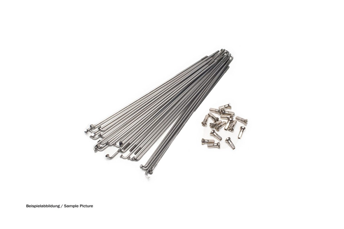 Scope of delivery: 36 stainless steel spokes, nickel plated steel nipples.