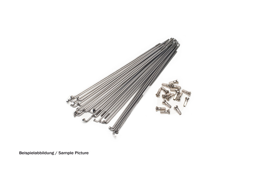 Scope of delivery: 36 stainless steel spokes, nickel plated steel nipples. Nickel-plated brass nipples on request.