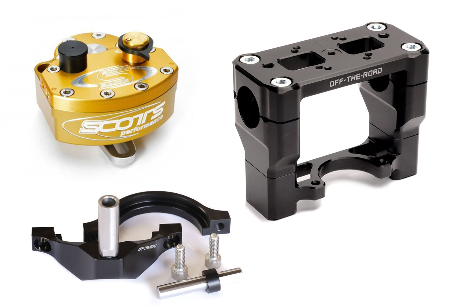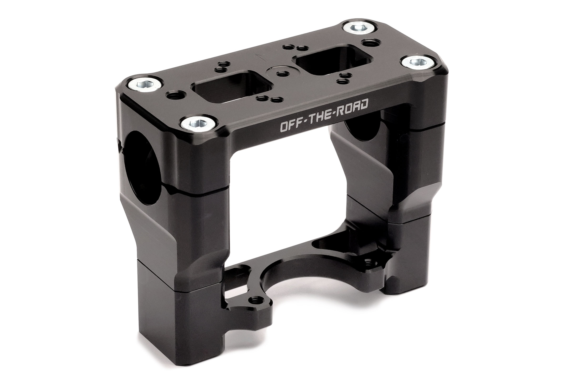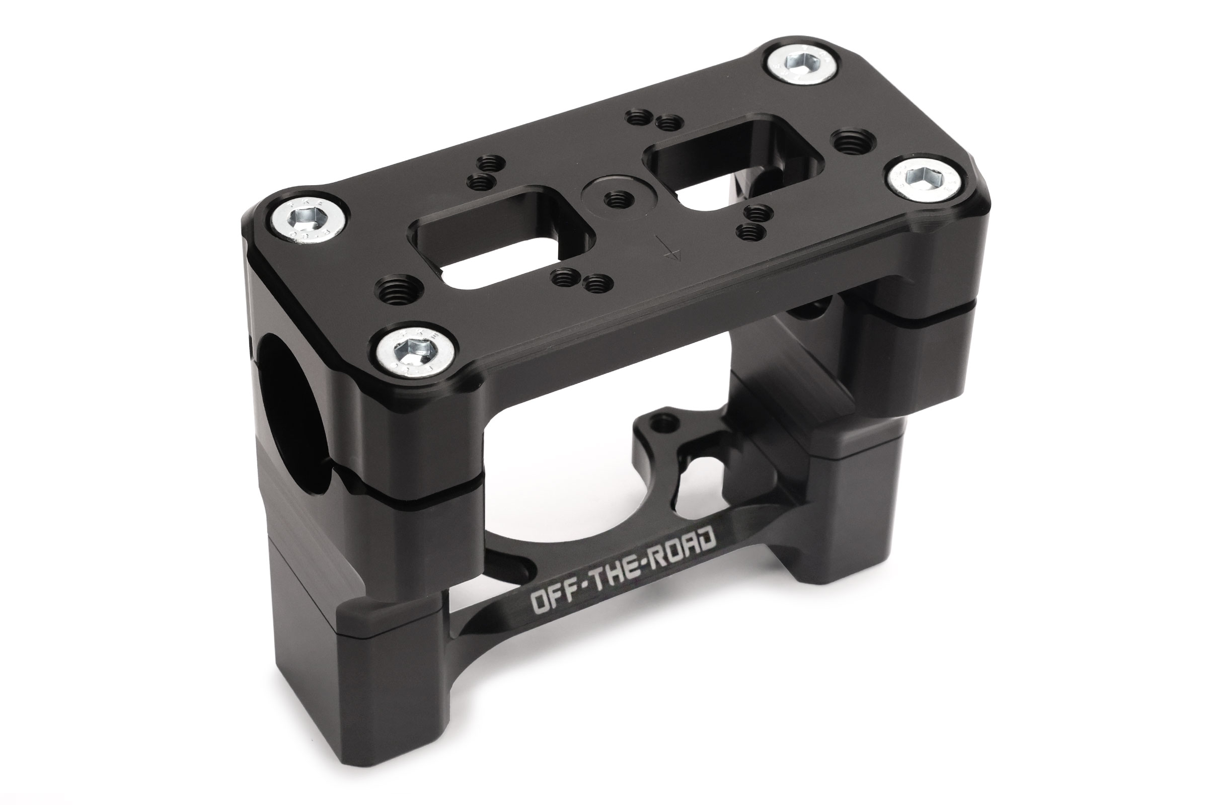 - OTR milled 4-piece handlebar clamp set with steering damper mount, black anodized