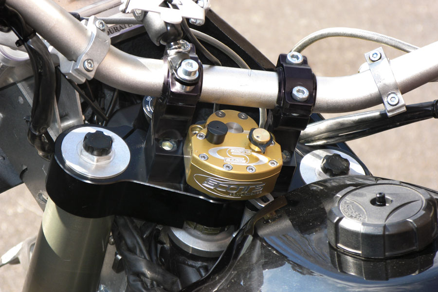 The Scotts damper itself is compact, fully adjustable, hydraulic shock absorbing damper that mounts to your steering head area right below your handlebar clamps withz cnc machined brackets. By helping to stabilize the front end of your motorcycle, the rear of the motorcycle will track straighter allowing the rest of your suspension to work better. In addition, the Scotts Steering Stabilizer eliminates that sudden “jolt” affect of having the handlebars pulled from your hands after unknowingly hitting something unforeseen like rocks, tree roots or rain ruts. It has also helps to minimize rider fatigue and the dreaded arm-pumping situation that occurs while wrestling the front end of your bike. Once mounted, it dramatically reduces the unwanted phenomenon known as “head-shake” that is commonly found on all off-road production motorcycles. It helps keep your motorcycle going straight in the whoops and smooths out those rough sections by preventing those handlebar wrenching jolts.