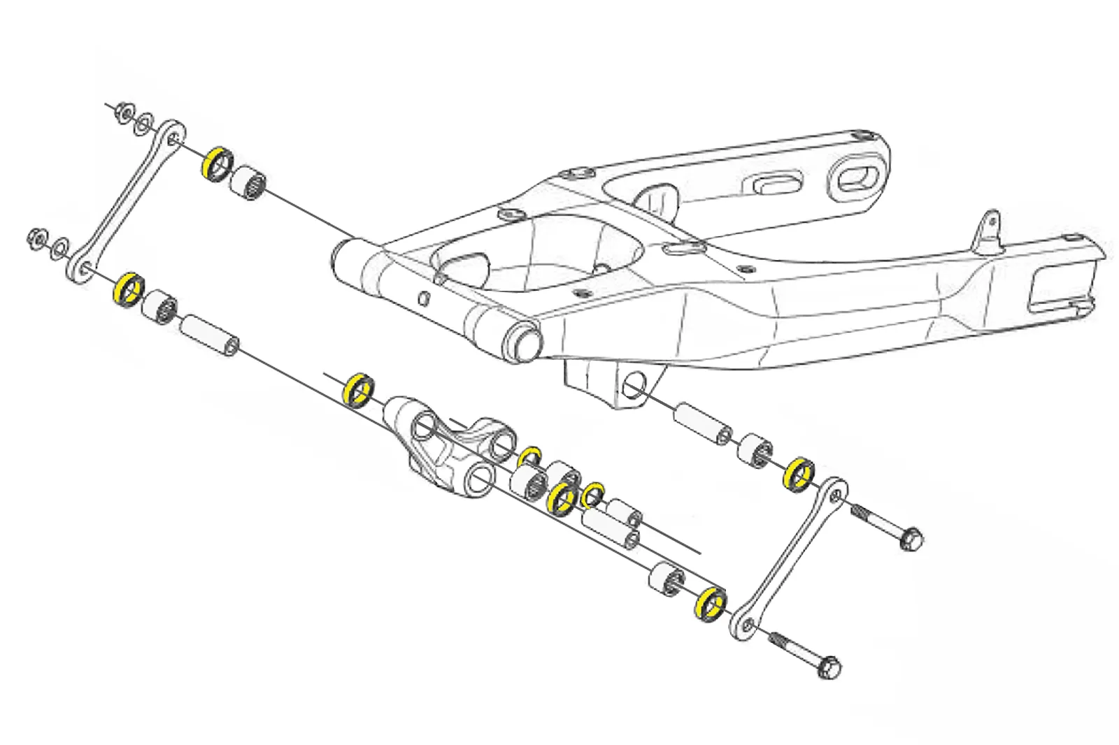 The set contains 8 seals for the swing arm linkage, for the bottom of swingarm and seals for the shock linkage.