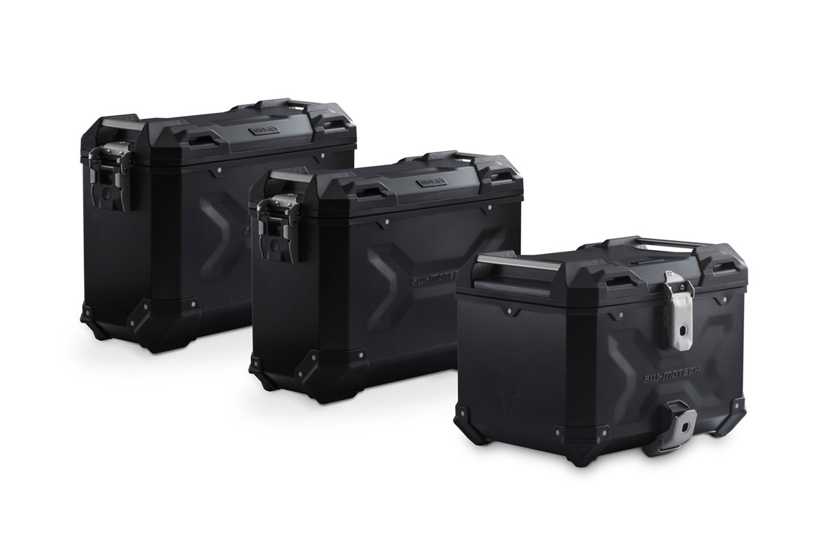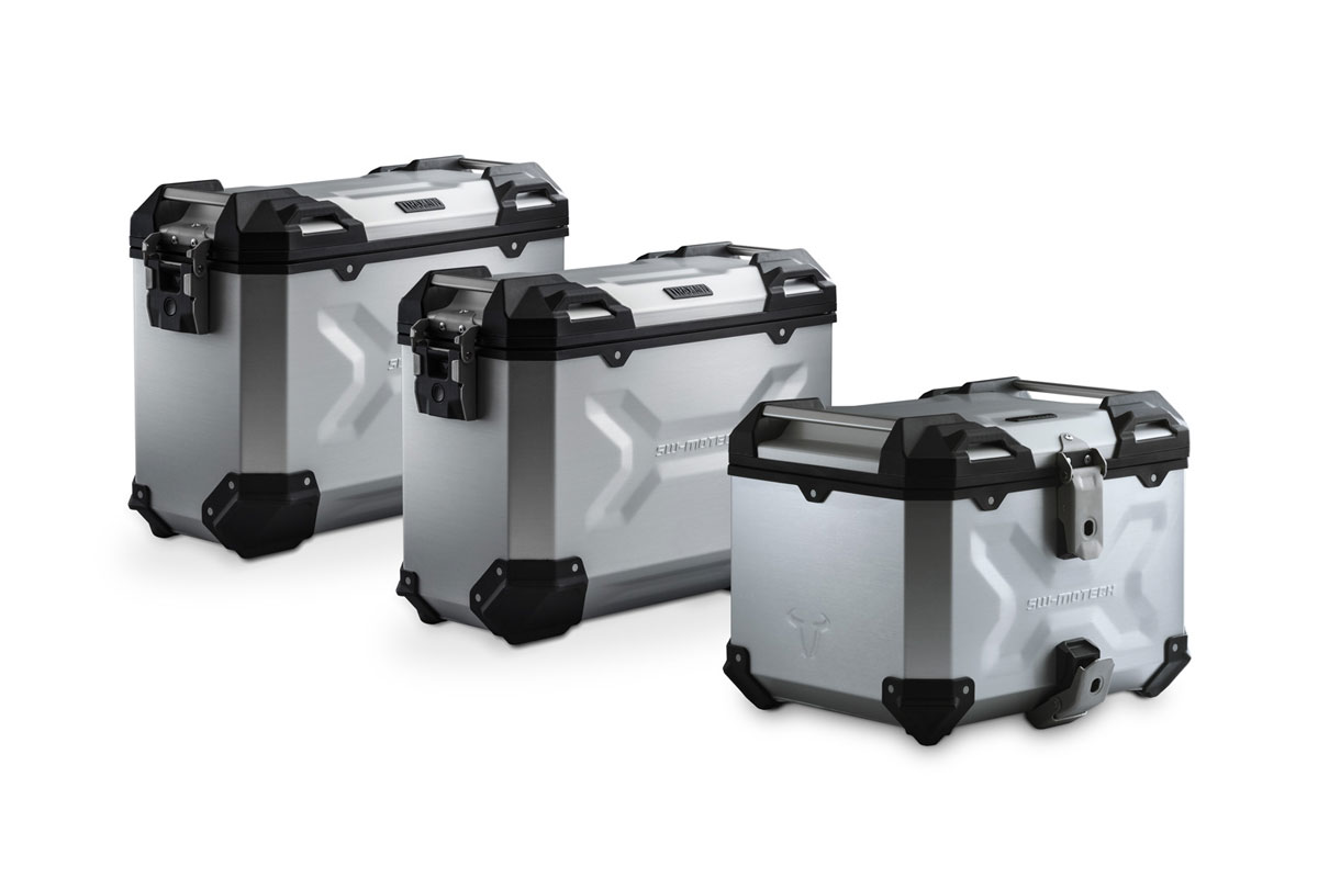 This set, consisting of two side cases and two side carriers, a topcase and a rack as well as additional accessories is an all-round carefree package for every tour. The water- and dustproof TRAX ADV premium aluminum case offers luggage the best protection. The bike-specific development of the Pro side carrier and the ADVENTURE-RACK guarantees the best fit and provides secure hold for the aluminum cases. The whole, attractive package is rounded out with additional accessories, such as a lock set, TRAX accessory bags, a multi-tool and the adapters needed to mount it on the trunk.