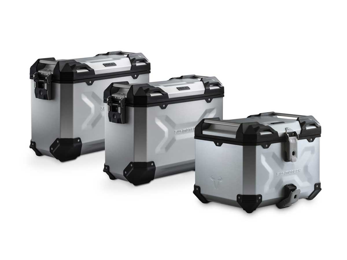 This set, consisting of two side cases and two side carriers, a topcase and a rack as well as additional accessories is an all-round carefree package for every tour. The water- and dustproof TRAX ADV premium aluminum case offers luggage the best protection. The bike-specific development of the EVO side carrier and the ALU-RACK guarantees the best fit and provides secure hold for the aluminum cases. The whole, attractive package is rounded out with additional accessories, such as a lock set, TRAX accessory bags, a multi-tool and the adapters needed to mount it on the trunk. With the Adventure set, your bike is ready for any adventure. This set is the all-round, care-free pack for any tour. The water and dust-tight TRAX ADV premium aluminum case, two side cases and a top case offer your luggage the best protection. The model-specific development of the detachable EVO rack and the ADVENTURE-RACK guarantee optimal fit and secure grip for aluminum cases. Our sturdy TRAX ADV aluminum cases convince with their stability, impermeability to water and dust, elegant optics, well-thought out features and a large selection of accessories. For even more storage this adventure set contains two TRAX M/L accessory bags. These are fastened to the side cases, are water-tight and the contents can be especially quickly accessed. Features of the TRAX ADV aluminum cases