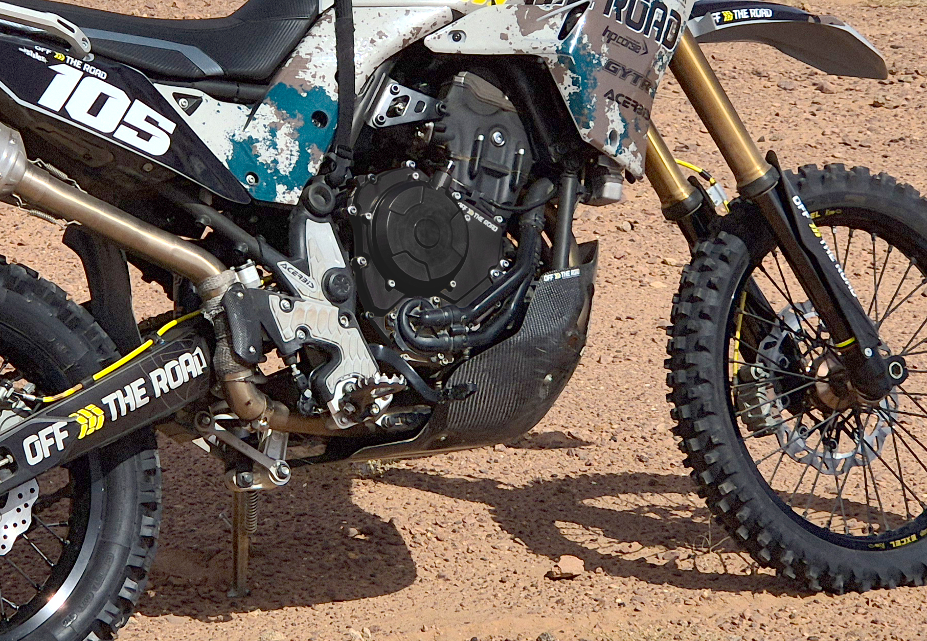 Seitlich weit hoch gezogene Flanken um die Wasserpumpe und den Motordeckel zu schützen. Die Front schützt den Krümmer und den Motorblock vor hochgewirbelten Steinen.