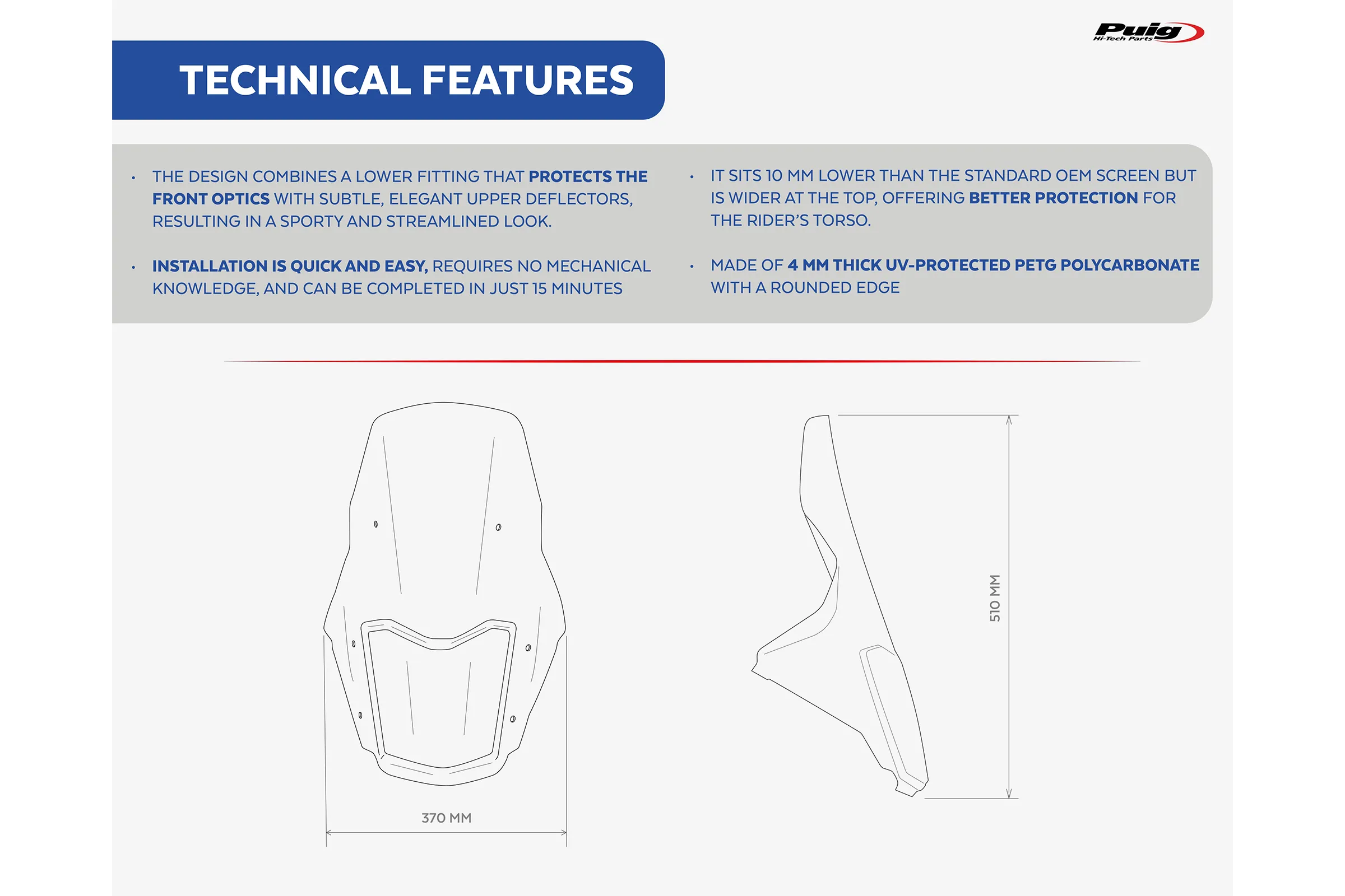 Ihr Design vereint die Doppelfunktion von Windschutzscheibe und Scheinwerferschutz in einem einzigen Bauteil und behält dabei klare Linien bei, die perfekt zur Frontpartie des Motorrads passen. Der untere Teil schützt die Frontoptik, während der obere Teil integrierte Deflektoren enthält, die den Luftstrom verbessern und für einen sportlichen, eleganten und dezent-aggressiven Look sorgen.