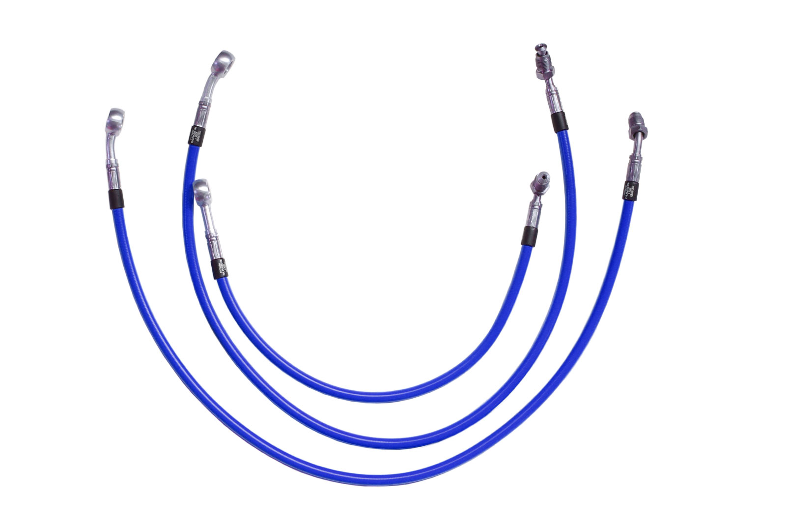 Lieferung inkl. Fittingen aus Aluminium oder Edelstahl. Die neuen Bremsleitungen verlaufen dann jeweils am rechten bzw. linken Gabelholm nach unten zu den Bremssätteln. Die Leitung vom rechten zum linken Bremssattel entfällt.